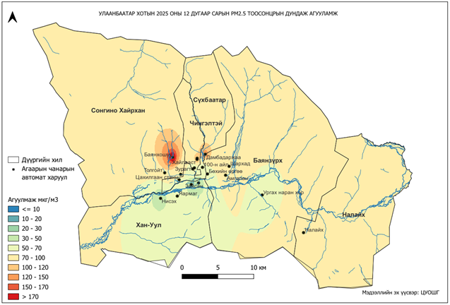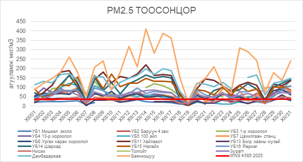2025 оны 12 дугаар сарын РМ2.5 тоосонцрын хоногийн дундаж агууламж 3-410 мкг/м3 байсан байна. РМ2.5 тоосонцрын хамгийн бага агууламж нь 12 дугаар сарын 19-нд Зайсан, Налайх орчим 3 мкг/м3, харин хамгийн их агууламж илэрсэн цэг 12 дугаар сарын 14-нд Баянхошуу орчим 410 мкг/м3 буюу MNS 4585:2025 АЧС-аас 10.9 дахин их байсан байна (Зураг 4).