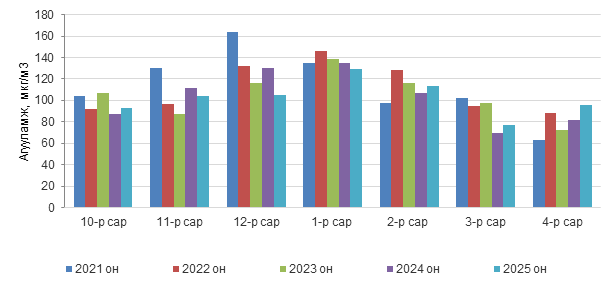 Зураг 5. PM10 тоосонцрын 12 дугаар сарын дундаж агууламж, 2021-2025 он