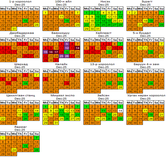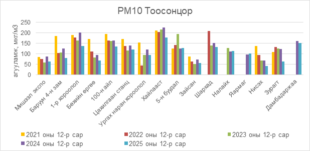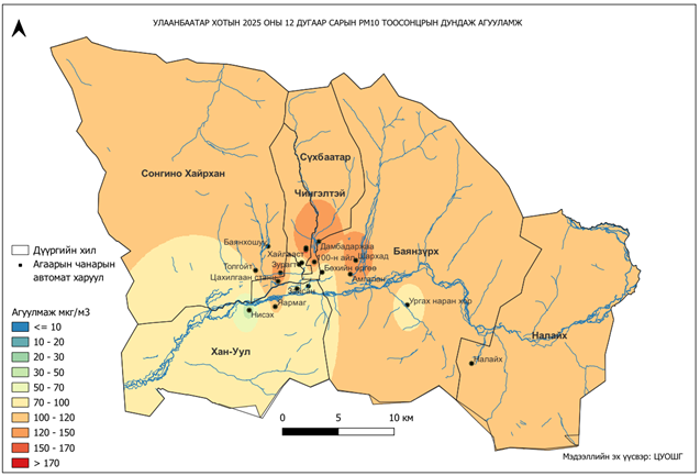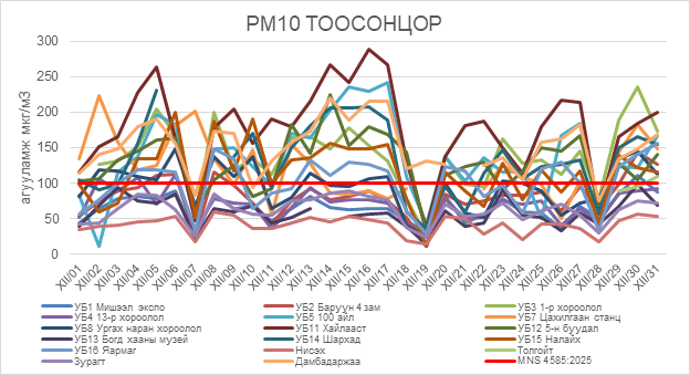 2025 оны 12 дугаар сарын РМ10 тоосонцрын хоногийн дундаж агууламж 11-288 мкг/м3 байсан байна. РМ10 тоосонцрын хамгийн бага агууламж нь 12 дугаар сарын 02-нд 100 айл орчим 11 мкг/м3, харин хамгийн их агууламж илэрсэн цэг 12 дугаар сарын 16-нд Хайлааст орчим 288 мкг/м3 буюу MNS 4585:2025 АЧС-аас 2.8 дахин их байсан байна (Зураг 7).