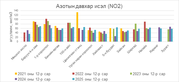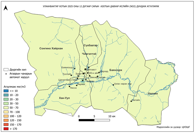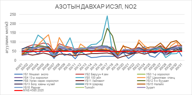 2025 оны 12 дугаар сарын азотын давхар исэл (NO2)-ийн хоногийн дундаж агууламж 9-242 мкг/м3 байсан байна. Азотын давхар исэл (NO2)-ийн хамгийн бага агууламж нь 12 дугаар сарын 11-нд Мишээл экспо орчим 9 мкг/м3, харин хамгийн их агууламж илэрсэн цэг 12 дугаар сарын 17-нд 100 айл орчим 242 мкг/м3 буюу MNS 4585:2025 АЧС-аас 4.8 дахин их байсан байна (Зураг 10).