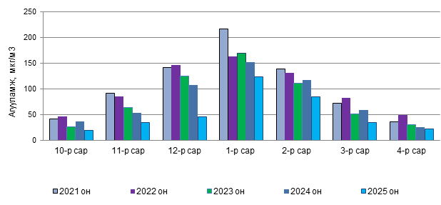 Зураг 11. Хүхэрлэг хийн 12 дугаар сарын дундаж агууламж, 2021-2025 он