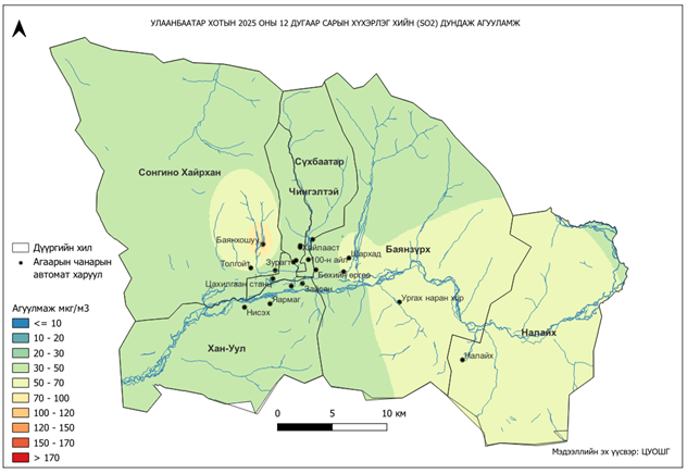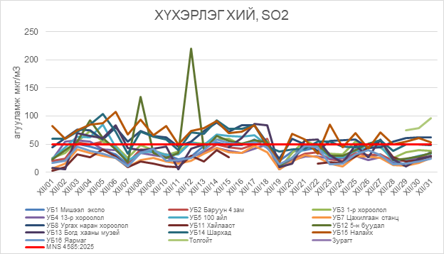 2025 оны 12 дугаар сарын хүхэрлэг хийн (SO2) хоногийн дундаж агууламж 3-220 мкг/м3 байсан байна. Хүхэрлэг хийн (SO2) хамгийн бага агууламж нь 12 дугаар сарын 01-нд Хайлааст орчим 3 мкг/м3, харин хамгийн их агууламж илэрсэн цэг 12 дугаар сарын 12-нд 5 буудал орчим 220 мкг/м3 буюу MNS 4585:2025 АЧС-аас 4.4 дахин их байсан байна (Зураг 13).
