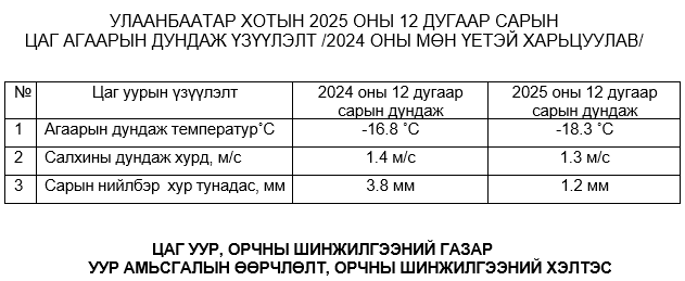2025 ОНЫ 12 ДУГААР САРЫН АГААРЫН ЧАНАРЫН ИНДЕКСИЙН МЭДЭЭ,