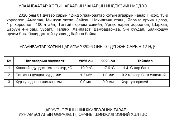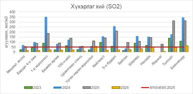 2026 оны 01 дүгээр сарын 12-ны байдлаар хүхэрлэг хий (SO2) нь Ургах наран хороолол орчим АЧС-аас 8 мкг/м3 –ээр их, Налайх орчим АЧС-аас 1 мкг/м3 –ээр их, Баянхошуу орчим АЧС-аас 14 мкг/м3 –ээр их, бусад цэгүүдэд MNS 4585:2025 АЧС-аас даваагүй байна.