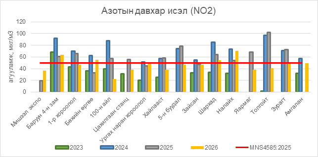 Азотын давхар исэл (NO2) нь Баруун 4-н зам орчим АЧС-аас 14 мкг/м3 –ээр их, Бөхийн өргөө орчим АЧС-аас 5 мкг/м3 –ээр их, Шархад орчим АЧС-аас 4 мкг/м3 –ээр их, Налайх орчим АЧС-аас 20 мкг/м3 –ээр их, бусад цэгүүдэд MNS 4585:2025 АЧС-аас даваагүй байна.