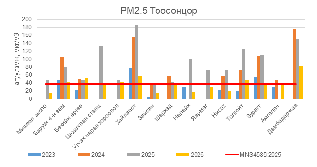 РМ2.5 тоосонцор нь Баруун 4-н зам орчим АЧС-аас 3.5 мкг/м3 –ээр их, Бөхийн өргөө орчим АЧС-аас 13.5 мкг/м3 –ээр их, Цахилгаан станц орчим АЧС-аас 1.5 мкг/м3 –ээр их, Ургах наран хороолол орчим АЧС-аас 5.5 мкг/м3 –ээр их, Хайлааст орчим АЧС-аас 19.5 мкг/м3 –ээр их, Толгойт орчим АЧС-аас 10.5 мкг/м3 –ээр их, Зурагт орчим АЧС-аас 1.5 мкг/м3 –ээр их, Дамбадаржаа орчим АЧС-аас 45.5 мкг/м3 –ээр их, бусад цэгүүдэд MNS 4585:2025 АЧС-аас даваагүй байна.