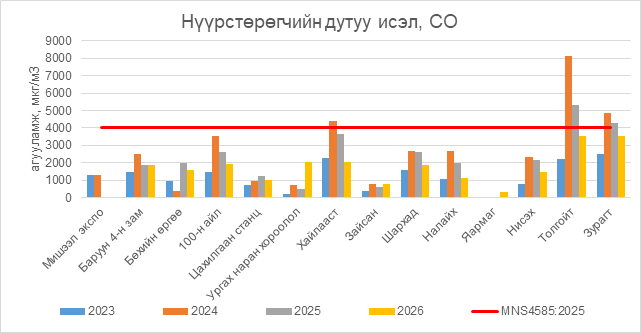 Нүүрстөрөгчийн дутуу исэл (СО) нь бүх цэгүүдэд MNS 4585:2025 АЧС-аас даваагүй байна.