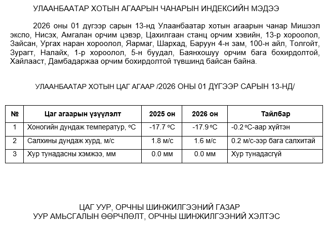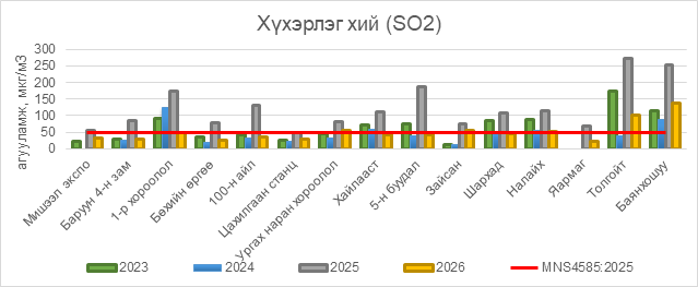 2026 оны 01 дүгээр сарын 13-ны байдлаар хүхэрлэг хий (SO2) нь Ургах наран хороолол орчим АЧС-аас 4 мкг/м3 –ээр их, Зайсан орчим АЧС-аас 4 мкг/м3 –ээр их, Налайх орчим АЧС-аас 2 мкг/м3 –ээр их, Толгойт орчим АЧС-аас 51 мкг/м3 –ээр их, Баянхошуу орчим АЧС-аас 87 мкг/м3 –ээр их, бусад цэгүүдэд MNS 4585:2025 АЧС-аас даваагүй байна.