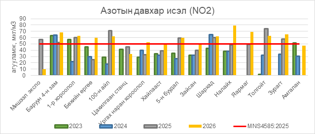 Азотын давхар исэл (NO2) нь Баруун 4-н зам орчим АЧС-аас 18 мкг/м3 –ээр их, 1-р хороолол орчим 13 мкг/м3 –ээр их, Бөхийн өргөө орчим АЧС-аас 10 мкг/м3 –ээр их, 100-н айл орчим АЧС-аас 12 мкг/м3 –ээр их, Ургах наран хороолол орчим АЧС-аас 3 мкг/м3 –ээр их, 5-н буудал орчим АЧС-аас 10 мкг/м3 –ээр их, Шархад орчим АЧС-аас 12 мкг/м3 –ээр их, Налайх орчим АЧС-аас 29 мкг/м3 –ээр их, Яармаг орчим АЧС-аас 19 мкг/м3 –ээр их, Толгойт орчим АЧС-аас 13 мкг/м3 –ээр их, Зурагт орчим АЧС-аас 15 мкг/м3 –ээр их байна.