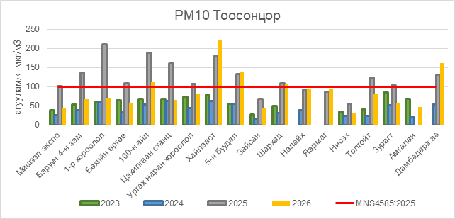 РМ10 тоосонцор нь 100-н айл орчим АЧС-аас 12 мкг/м3 –ээр их, Хайлааст орчим АЧС-аас 122 мкг/м3 –ээр их, 5-н буудал орчим АЧС-аас 39 мкг/м3 –ээр их, Шархад орчим АЧС-аас 8 мкг/м3 –ээр их, Дамбадаржаа орчим АЧС-аас 61 мкг/м3 –ээр их, бусад цэгүүдэд MNS 4585:2025 АЧС-аас даваагүй байна.