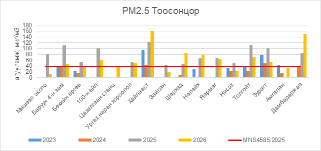 РМ2.5 тоосонцор нь Баруун 4-н зам орчим АЧС-аас 9.5 мкг/м3 –ээр их, Бөхийн өргөө орчим АЧС-аас 1.5 мкг/м3 –ээр их, 100-н айл орчим АЧС-аас 19.5 мкг/м3 –ээр их, Ургах наран хороолол орчим АЧС-аас 9.5 мкг/м3 –ээр их, Хайлааст орчим АЧС-аас 123.5 мкг/м3 –ээр их, Шархад орчим АЧС-аас 48.5 мкг/м3 –ээр их, Налайх орчим АЧС-аас 40.5 мкг/м3 –ээр их, Яармаг орчим АЧС-аас 25.5 мкг/м3 –ээр их, Толгойт орчим АЧС-аас 34.5 мкг/м3 –ээр их, Зурагт орчим АЧС-аас 16.5 мкг/м3 –ээр их, Дамбадаржаа орчим АЧС-аас 113.5 мкг/м3 –ээр их байна.
