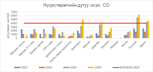 Нүүрстөрөгчийн дутуу исэл (СО) нь Хайлааст орчим АЧС-аас 947 мкг/м3 –ээр их, Шархад орчим АЧС-аас 54 мкг/м3 –ээр их, Толгойт орчим АЧС-аас 2330 мкг/м3 –ээр их, Зурагт орчим АЧС-аас 687 мкг/м3 –ээр их, бусад цэгүүдэд MNS 4585:2025 АЧС-аас даваагүй байна.