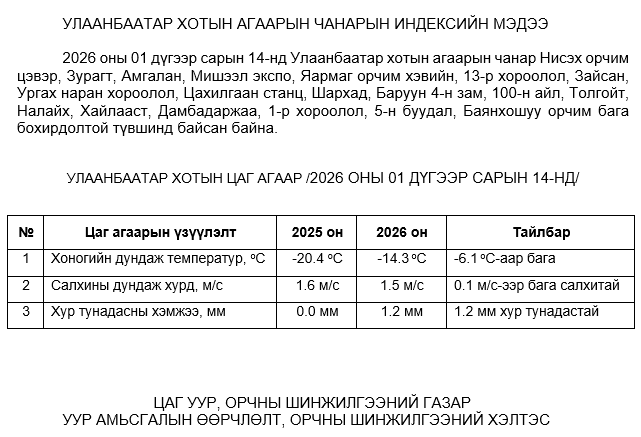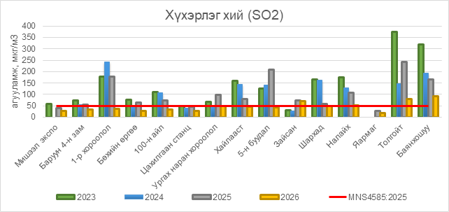 2026 оны 01 дүгээр сарын 14-ний байдлаар хүхэрлэг хий (SO2) нь Зайсан орчим АЧС-аас 20 мкг/м3 –ээр их, Налайх орчим АЧС-аас 2 мкг/м3 –ээр их, Толгойт орчим АЧС-аас 29 мкг/м3 –ээр их, Баянхошуу орчим АЧС-аас 41 мкг/м3 –ээр их, бусад цэгүүдэд MNS 4585:2025 АЧС-аас даваагүй байна.