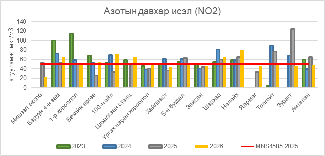 Азотын давхар исэл (NO2) нь Баруун 4-н зам орчим АЧС-аас 14 мкг/м3 –ээр их, 1-р хороолол орчим 3 мкг/м3 –ээр их, Бөхийн өргөө орчим АЧС-аас 5 мкг/м3 –ээр их, 100-н айл орчим АЧС-аас 22 мкг/м3 –ээр их, Цахилгаан станц орчим АЧС-аас 14 мкг/м3 –ээр их, 5-н буудал орчим АЧС-аас 2 мкг/м3 –ээр их, Шархад орчим АЧС-аас 14 мкг/м3 –ээр их, Налайх орчим АЧС-аас 31 мкг/м3 –ээр их, бусад цэгүүдэд MNS 4585:2025 АЧС-аас даваагүй байна.