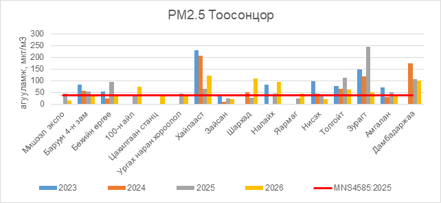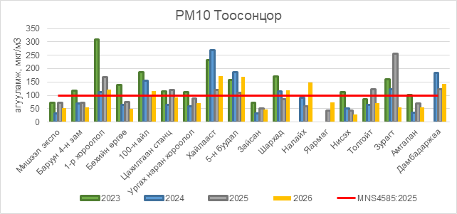 РМ10 тоосонцор нь 1-р хороолол орчим АЧС-аас 21 мкг/м3 –ээр их, 100-н айл орчим АЧС-аас 16 мкг/м3 –ээр их, Хайлааст орчим АЧС-аас 72 мкг/м3 –ээр их, 5-н буудал орчим АЧС-аас 69 мкг/м3 –ээр их, Шархад орчим АЧС-аас 19 мкг/м3 –ээр их, Налайх орчим АЧС-аас 49 мкг/м3 –ээр их, Дамбадаржаа орчим АЧС-аас 44 мкг/м3 –ээр их, бусад цэгүүдэд MNS 4585:2025 АЧС-аас даваагүй байна.