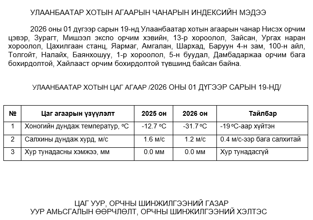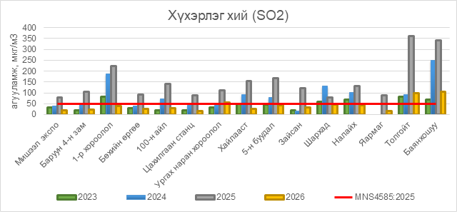 2026 оны 01 дүгээр сарын 19-ний байдлаар хүхэрлэг хий (SO2) нь Ургах наран хороолол орчим АЧС-аас 5 мкг/м3 –ээр их, Толгойт орчим АЧС-аас 50 мкг/м3 –ээр их, Баянхошуу орчим АЧС-аас 55 мкг/м3 –ээр их, бусад цэгүүдэд MNS 4585:2025 АЧС-аас даваагүй байна.