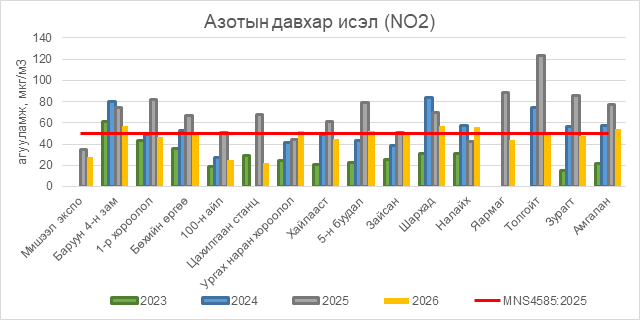 Азотын давхар исэл (NO2) нь Баруун 4-н зам орчим АЧС-аас 7 мкг/м3 –ээр их, Ургах наран хороолол орчим АЧС-аас 2 мкг/м3 –ээр их, 5-н буудал орчим АЧС-аас 2 мкг/м3 –ээр их, Шархад орчим АЧС-аас 7 мкг/м3 –ээр их, Налайх орчим АЧС-аас 6 мкг/м3 –ээр их, Амгалан орчим АЧС-аас 4 мкг/м3 –ээр их, бусад цэгүүдэд MNS 4585:2025 АЧС-аас даваагүй байна.