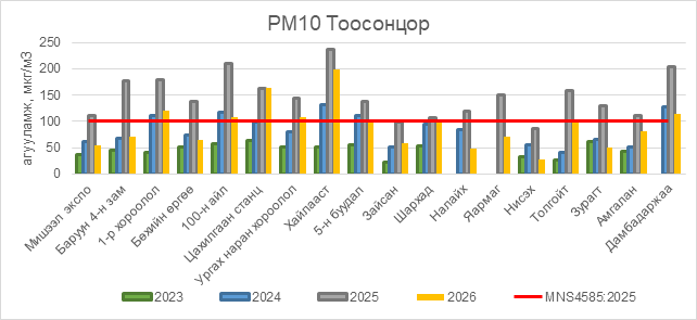 РМ10 тоосонцор нь 1-р хороолол орчим АЧС-аас 20 мкг/м3 –ээр их, 100-н айл орчим АЧС-аас 8 мкг/м3 –ээр их, Цахилгаан станц орчим АЧС-аас 63 мкг/м3 –ээр их, Ургах наран хороолол орчим АЧС-аас 8 мкг/м3 –ээр их, Хайлааст орчим АЧС-аас 98 мкг/м3 –ээр их, Дамбадаржаа орчим АЧС-аас 14 мкг/м3 –ээр их, бусад цэгүүдэд MNS 4585:2025 АЧС-аас даваагүй байна.