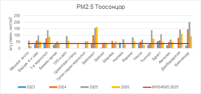 РМ2.5 тоосонцор нь Баруун 4-н зам орчим АЧС-аас 12.5 мкг/м3 –ээр их, 1-р хороолол орчим АЧС-аас 50.5 мкг/м3 –ээр их, Бөхийн өргөө орчим АЧС-аас 1.5 мкг/м3 –ээр их, 100-н айл орчим АЧС-аас 18.5 мкг/м3 –ээр их, Цахилгаан станц орчим АЧС-аас 3.5 мкг/м3 –ээр их, Ургах наран хороолол орчим АЧС-аас 16.5 мкг/м3 –ээр их, Хайлааст орчим АЧС-аас 126.5 мкг/м3 –ээр их, Шархад орчим АЧС-аас 15.5 мкг/м3 –ээр их, Яармаг орчим АЧС-аас 15.5 мкг/м3 –ээр их, Толгойт орчим АЧС-аас 37.5 мкг/м3 –ээр их, Зурагт орчим АЧС-аас 9.5 мкг/м3 –ээр их, Дамбадаржаа орчим АЧС-аас 72.5 мкг/м3 –ээр их, Баянхошуу орчим АЧС-аас 52.5 мкг/м3 –ээр их байна.