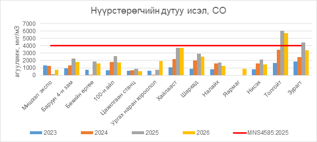 Нүүрстөрөгчийн дутуу исэл (СО) нь Толгойт орчим АЧС-аас 1720 мкг/м3 –ээр их, бусад цэгүүдэд MNS 4585:2025 АЧС-аас даваагүй байна.