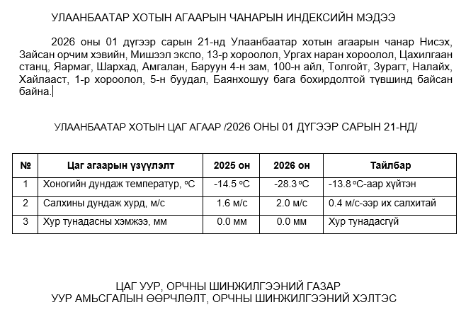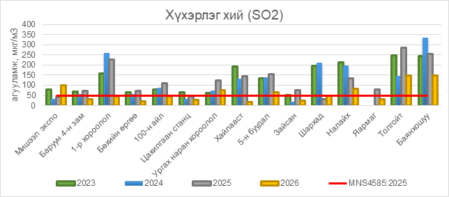 2026 оны 01 дүгээр сарын 21-ний байдлаар хүхэрлэг хий (SO2) нь Мишээл экспо орчим АЧС-аас 50 мкг/м3 –ээр их, Ургах наран хороолол орчим АЧС-аас 25 мкг/м3 –ээр их, 5-н буудал орчим АЧС-аас 17 мкг/м3 –ээр их, Налайх орчим АЧС-аас 34 мкг/м3 –ээр их, Толгойт орчим АЧС-аас 97 мкг/м3 –ээр их, Баянхошуу орчим АЧС-аас 97 мкг/м3 –ээр их, бусад цэгүүдэд MNS 4585:2025 АЧС-аас даваагүй байна.