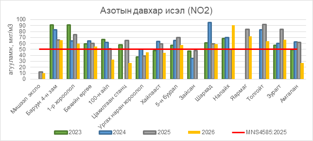 Азотын давхар исэл (NO2) нь Баруун 4-н зам орчим АЧС-аас 15 мкг/м3 –ээр их, 1-р хороолол орчим 10 мкг/м3 –ээр их, Бөхийн өргөө орчим АЧС-аас 5 мкг/м3 –ээр их, 5-н буудал орчим АЧС-аас 7 мкг/м3 –ээр их, Шархад орчим АЧС-аас 9 мкг/м3 –ээр их, Налайх орчим АЧС-аас 41 мкг/м3 –ээр их, Яармаг орчим АЧС-аас 22 мкг/м3 –ээр их, Толгойт орчим АЧС-аас 14 мкг/м3 –ээр их, Зурагт орчим АЧС-аас 16 мкг/м3 –ээр их, бусад цэгүүдэд MNS 4585:2025 АЧС-аас даваагүй байна.