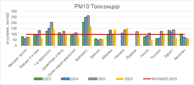РМ10 тоосонцор нь 1-р хороолол орчим АЧС-аас 43 мкг/м3 –ээр их, Цахилгаан станц орчим АЧС-аас 1 мкг/м3 –ээр их, Хайлааст орчим АЧС-аас 68 мкг/м3 –ээр их, Шархад орчим АЧС-аас 42 мкг/м3 –ээр их, Налайх орчим АЧС-аас 52 мкг/м3 –ээр их, Толгойт орчим АЧС-аас 6 мкг/м3 –ээр их, бусад цэгүүдэд MNS 4585:2025 АЧС-аас даваагүй байна.