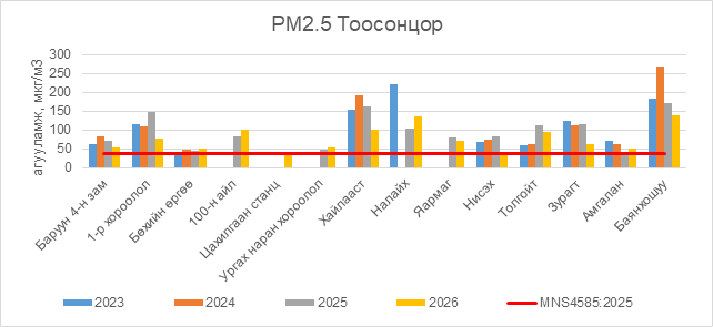 РМ2.5 тоосонцор нь Баруун 4-н зам орчим АЧС-аас 17.5 мкг/м3 –ээр их, 1-р хороолол орчим АЧС-аас 39.5 мкг/м3 –ээр их, Бөхийн өргөө орчим АЧС-аас 14.5 мкг/м3 –ээр их, 100-н айл орчим АЧС-аас 62.5 мкг/м3 –ээр их, Цахилгаан станц орчим АЧС-аас 4.5 мкг/м3 –ээр их, Ургах наран хороолол орчим АЧС-аас 15.5 мкг/м3 –ээр их, Хайлааст орчим АЧС-аас 62.5 мкг/м3 –ээр их, Налайх орчим АЧС-аас 98.5 мкг/м3 –ээр их, Яармаг орчим АЧС-аас 33.5 мкг/м3 –ээр их, Нисэх орчим АЧС-аас 0.5 мкг/м3 –ээр их, Толгойт орчим АЧС-аас 57.5 мкг/м3 –ээр их, Зурагт орчим АЧС-аас 26.5 мкг/м3 –ээр их, Амгалан орчим АЧС-аас 14.5 мкг/м3 –ээр их, Баянхошуу орчим АЧС-аас 100.5 мкг/м3 –ээр их байна.