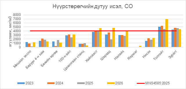 Нүүрстөрөгчийн дутуу исэл (СО) нь Хайлааст орчим АЧС-аас 719 мкг/м3 –ээр их, Шархад орчим АЧС-аас 762 мкг/м3 –ээр их, Налайх орчим АЧС-аас 19 мкг/м3 –ээр их, Толгойт орчим АЧС-аас 2950 мкг/м3 –ээр их, Зурагт орчим АЧС-аас 406 мкг/м3 –ээр их, бусад цэгүүдэд MNS 4585:2025 АЧС-аас даваагүй байна.
