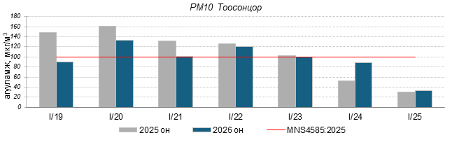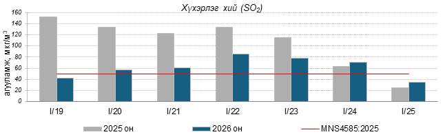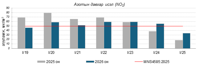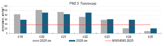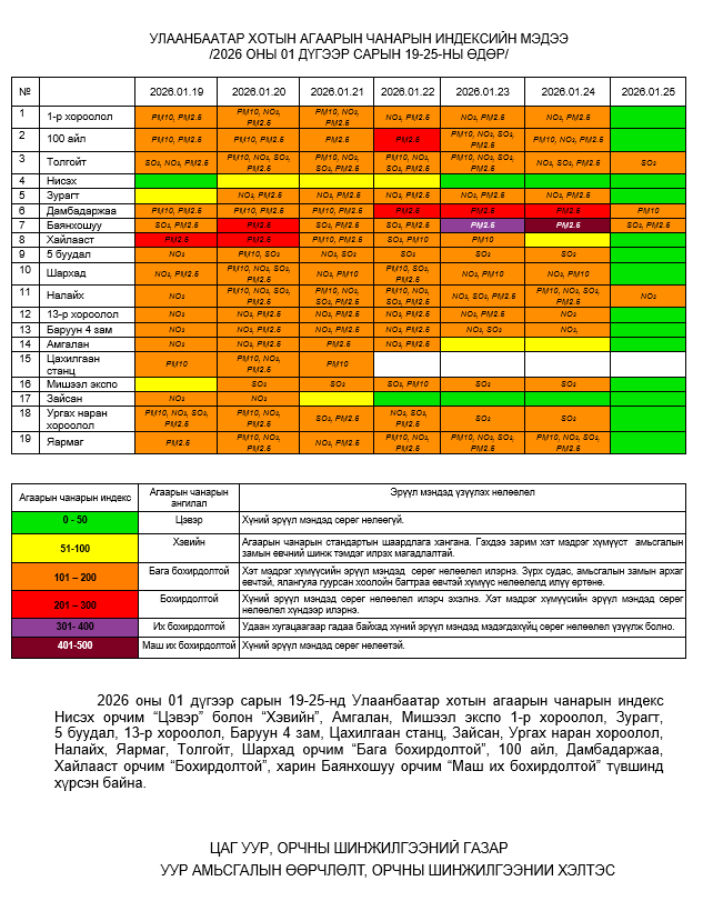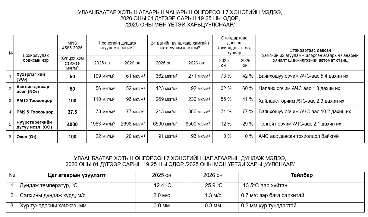 Улаанбаатар хотын агаарт түгээмэл бохирдуулах бодис хүхэрлэг хий /SO2/, азотын давхар исэл /NO2/, тоосонцор /PM10, PM2.5/, нүүрстөрөгчийн дутуу исэл /CO/, озон /O3/-ны агууламжийг тодорхойллоо.
