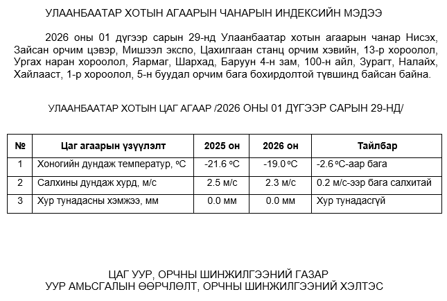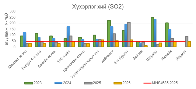 2026 оны 01 дүгээр сарын 29-ний байдлаар хүхэрлэг хий (SO2) нь Ургах наран хороолол орчим АЧС-аас 8 мкг/м3 –ээр их, Хайлааст орчим АЧС-аас 1 мкг/м3 –ээр их, 5-н буудал орчим АЧС-аас 10 мкг/м3 –ээр их, бусад цэгүүдэд MNS 4585:2025 АЧС-аас даваагүй байна.