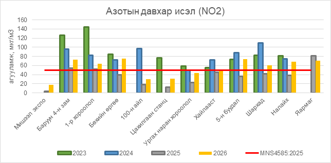 Азотын давхар исэл (NO2) нь Баруун 4-н зам орчим АЧС-аас 23 мкг/м3 –ээр их, 1-р хороолол орчим 14 мкг/м3 –ээр их, Бөхийн өргөө орчим АЧС-аас 25 мкг/м3 –ээр их, 5-н буудал орчим АЧС-аас 24 мкг/м3 –ээр их, Шархад орчим АЧС-аас 11 мкг/м3 –ээр их, Налайх орчим АЧС-аас 18 мкг/м3 –ээр их, Яармаг орчим АЧС-аас 21 мкг/м3 –ээр их, Зурагт орчим АЧС-аас 18 мкг/м3 –ээр их, бусад цэгүүдэд MNS 4585:2025 АЧС-аас даваагүй байна.