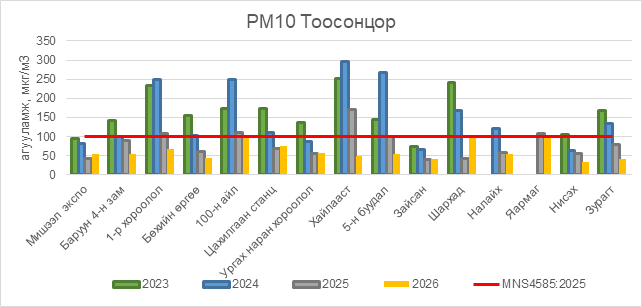 РМ10 тоосонцор нь 100-н айл орчим АЧС-аас 2 мкг/м3 –ээр их, бусад цэгүүдэд MNS 4585:2025 АЧС-аас даваагүй байна.