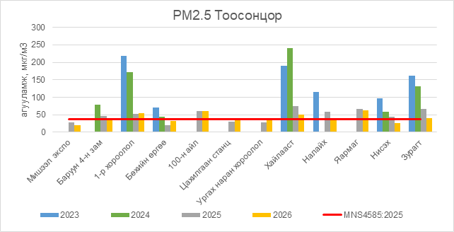 РМ2.5 тоосонцор нь Баруун 4-н зам орчим АЧС-аас 0.5 мкг/м3 –ээр их, 1-р хороолол орчим АЧС-аас 16.5 мкг/м3 –ээр их, 100-н айл орчим АЧС-аас 22.5 мкг/м3 –ээр их, Хайлааст орчим АЧС-аас 12.5 мкг/м3 –ээр их, Яармаг орчим АЧС-аас 24.5 мкг/м3 –ээр их, Зурагт орчим АЧС-аас 2.5 мкг/м3 –ээр их, бусад цэгүүдэд MNS 4585:2025 АЧС-аас даваагүй байна.