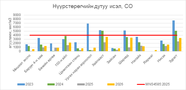 Нүүрстөрөгчийн дутуу исэл (СО) нь бүх цэгүүдэд MNS 4585:2025 АЧС-аас даваагүй байна.