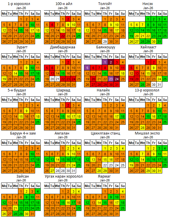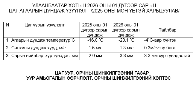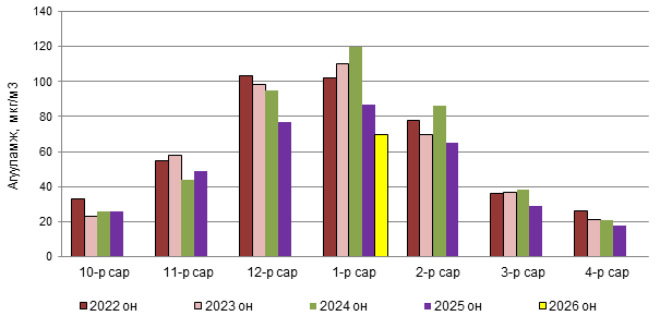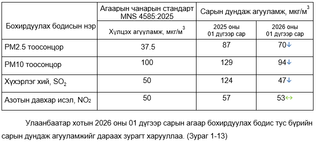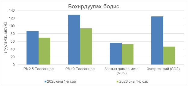 Улаанбаатар хотын агаар бохирдуулах бодисын 2026 оны 01 дүгээр сарын дундаж агууламжийг өмнөх оны мөн үе буюу 2025 оны 01 дүгээр сарын дундаж агууламжтай харьцуулахад PM2.5 тоосонцор 17 мкг/м3-ээр буюу 19 %-иар, PM10 тоосонцор 35 мкг/м3-ээр буюу 27 %-иар, хүхэрлэг хий (SO2) нь 77 мкг/м3-ээр буюу 62 %-иар, азотын давхар исэл (NO2) нь 4 мкг/м3-ээр буюу 7 %-иар тус тус бага байна.