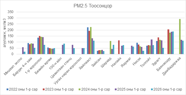 2026 оны 01 дүгээр сарын РМ2.5 тоосонцрын дундаж агууламжийг 2025 оны 01 дүгээр сартай харьцуулахад Мишээл экспо 37 мкг/м3-ээр, Баруун 4 зам 35 мкг/м3-ээр, 1-р хороолол 64 мкг/м3-ээр, Цахилгаан станц 26 мкг/м3-ээр, Ургах наран хороолол 1 мкг/м3, Хайлааст 19 мкг/м3-ээр, Зайсан 10 мкг/м3-ээр их, Яармаг 8 мкг/м3-ээр, Нисэх 31 мкг/м3-ээр, Толгойт 47 мкг/м3-ээр, Зурагт 60 мкг/м3-ээр, Дамбадаржаа 8 мкг/м3-ээр бага байна. Харин Бөхийн өргөө 6 мкг/м3-ээр, 100 айл 11 мкг/м3, Шархад 33 мкг/м3-ээр, Налайх 3 мкг/м3-ээр, Баянхошуу 2 мкг/м3-ээр их байна (Зураг 3).
