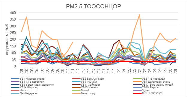 2026 оны 01 дүгээр сарын РМ2.5 тоосонцрын хоногийн дундаж агууламж 3-386 мкг/м3 байсан байна. РМ2.5 тоосонцрын хамгийн бага агууламж нь 01 дүгээр сарын 16-нд Зайсан орчим 3 мкг/м3, харин хамгийн их агууламж илэрсэн цэг 01 дүгээр сарын 24-нд Баянхошуу орчим 386 мкг/м3 буюу MNS 4585:2025 АЧС-аас 10.2 дахин их байсан байна (Зураг 4).