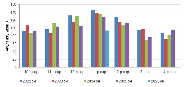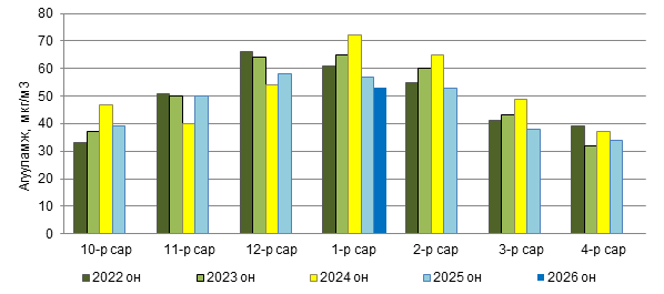 Улаанбаатар хотын агаар дахь PM10 тоосонцрын 2026 оны 01 дүгээр сарын дундаж агууламжийг 2022-2024 оны 01 дүгээр дундаж агууламжтай харьцуулахад 41-52 мкг/м3-ээр буюу 30-36 %-иар бага, өмнөх оны мөн үе буюу 2025 оны 01 дүгээр сарын дундаж агууламжаас 35 мкг/м3-ээр буюу 27 %-иар бага байна (Зураг 5).