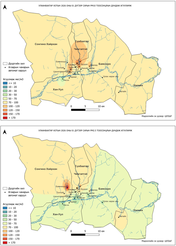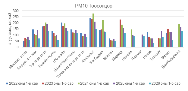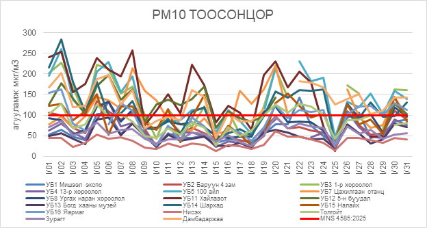2026 оны 01 дүгээр сарын РМ10 тоосонцрын хоногийн дундаж агууламж 13-283 мкг/м3 байсан байна. РМ10 тоосонцрын хамгийн бага агууламж нь 01 дүгээр сарын 15-нд Нисэх орчим 13 мкг/м3, харин хамгийн их агууламж илэрсэн цэг 01 дүгээр сарын 02-нд Шархад орчим 283 мкг/м3 буюу MNS 4585:2025 АЧС-аас 2.8 дахин их байсан байна (Зураг 7).