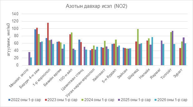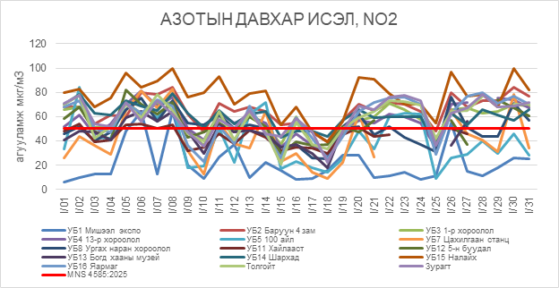 2026 оны 01 дүгээр сарын азотын давхар исэл (NO2)-ийн хоногийн дундаж агууламж 6-100 мкг/м3 байсан байна. Азотын давхар исэл (NO2)-ийн хамгийн бага агууламж нь 01 дүгээр сарын 01-нд Мишээл экспо орчим 6 мкг/м3, харин хамгийн их агууламж илэрсэн цэг 01 дүгээр сарын 08-нд Налайх орчим 100 мкг/м3 буюу MNS 4585:2025 АЧС-аас 2 дахин их байсан байна (Зураг 10).