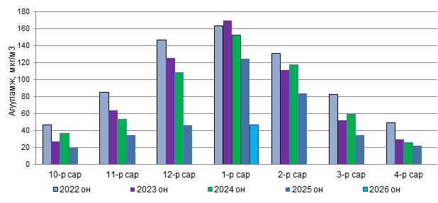 Зураг 11. Хүхэрлэг хийн 01 дүгээр сарын дундаж агууламж, 2022-2026 он