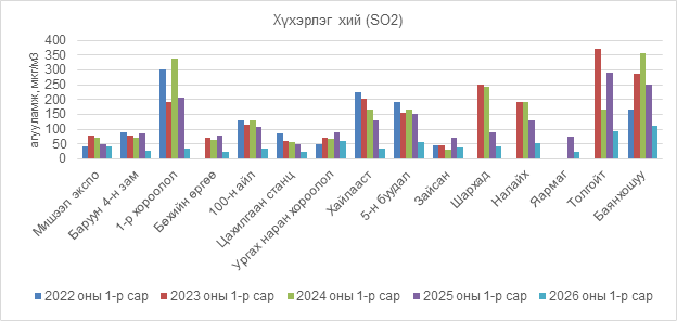 2026 оны 01 дүгээр сарын хүхэрлэг хий (SO2)-н дундаж агууламжийг 2025 оны 01 дүгээр сартай харьцуулахад Мишээл экспо 7 мкг/м3-ээр, Баруун 4 зам 57 мкг/м3-ээр, 1-р хороолол 172 мкг/м3-ээр, Бөхийн өргөө 54 мкг/м3-ээр, 100 айл 71 мкг/м3-ээр, Цахилгаан станц 29 мкг/м3-ээр, Ургах наран хороолол 28 мкг/м3-ээр, Хайлааст 94 мкг/м3-ээр, 5 буудал 96 мкг/м3-ээр, Зайсан 34 мкг/м3-ээр, Шархад 48 мкг/м3-ээр, Налайх 75 мкг/м3-ээр, Яармаг 51 мкг/м3-ээр, Толгойт 196 мкг/м3-ээр, Баянхошуу 138 мкг/м3-ээр тус тус бага байна (Зураг 12).