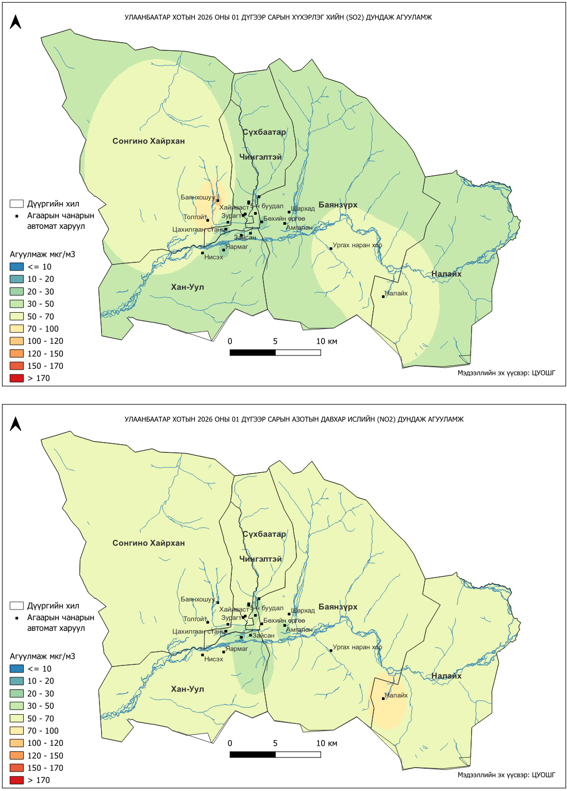 2026 оны 01 дүгээр сарын хүхэрлэг хийн (SO2) хоногийн дундаж агууламж 1-163 мкг/м3 байсан байна. Хүхэрлэг хийн (SO2) хамгийн бага агууламж нь 01 дүгээр сарын 16-нд Зайсан орчим 1 мкг/м3, харин хамгийн их агууламж илэрсэн цэг 01 дүгээр сарын 28-нд 5 буудал орчим 163 мкг/м3 буюу MNS 4585:2025 АЧС-аас 3.2 дахин их байсан байна (Зураг 13).