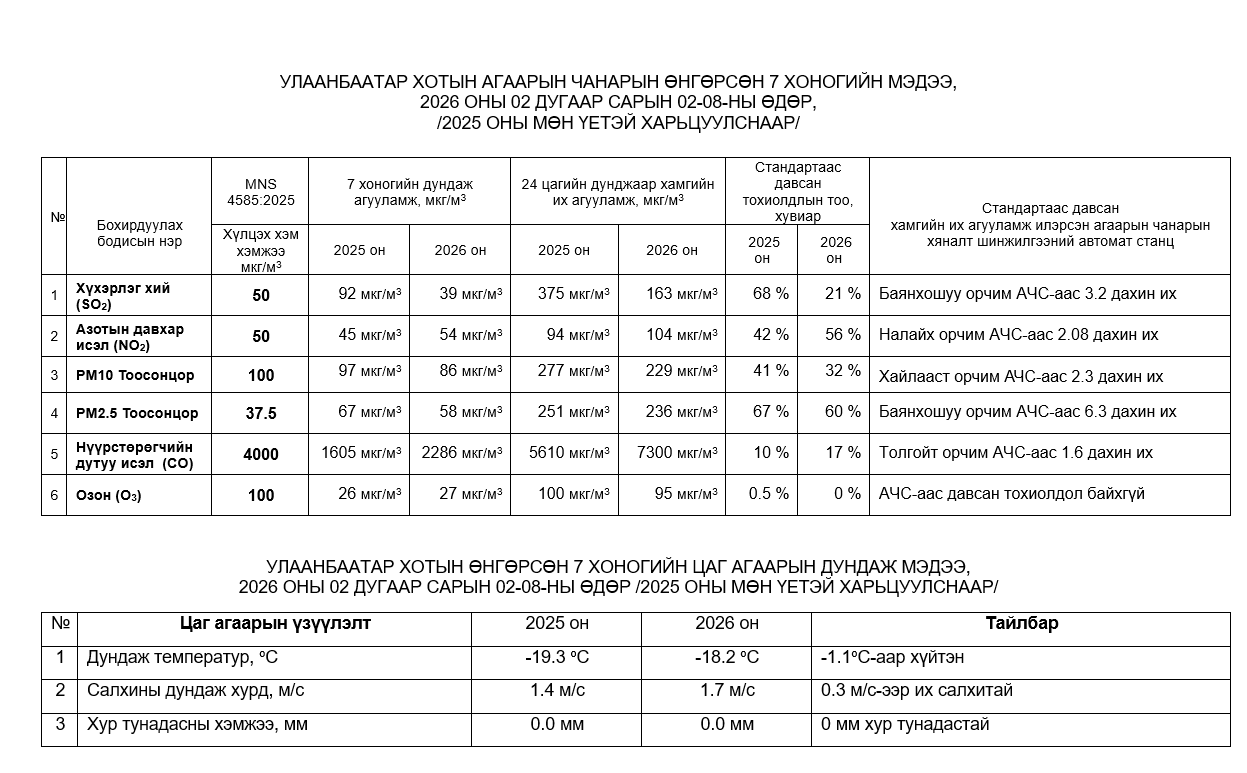 УЛААНБААТАР ХОТЫН АГААРЫН ЧАНАРЫН 7 ХОНОГИЙН МЭДЭЭ /2026.04.06-2026.04.12/