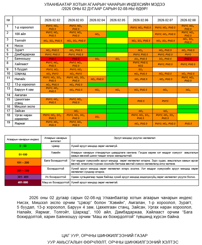 УЛААНБААТАР ХОТЫН АГААРЫН ЧАНАРЫН ХЯНАЛТ ШИНЖИЛГЭЭНИЙ ХОНОГИЙН МЭДЭЭ /2026.04.14/