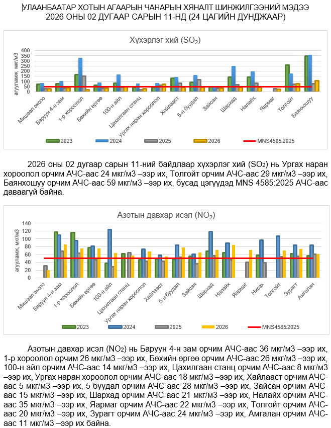 УЛААНБААТАР ХОТЫН АГААРЫН ЧАНАРЫН ХЯНАЛТ ШИНЖИЛГЭЭНИЙ ХОНОГИЙН МЭДЭЭ /2026.04.14/
