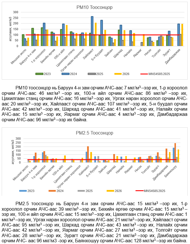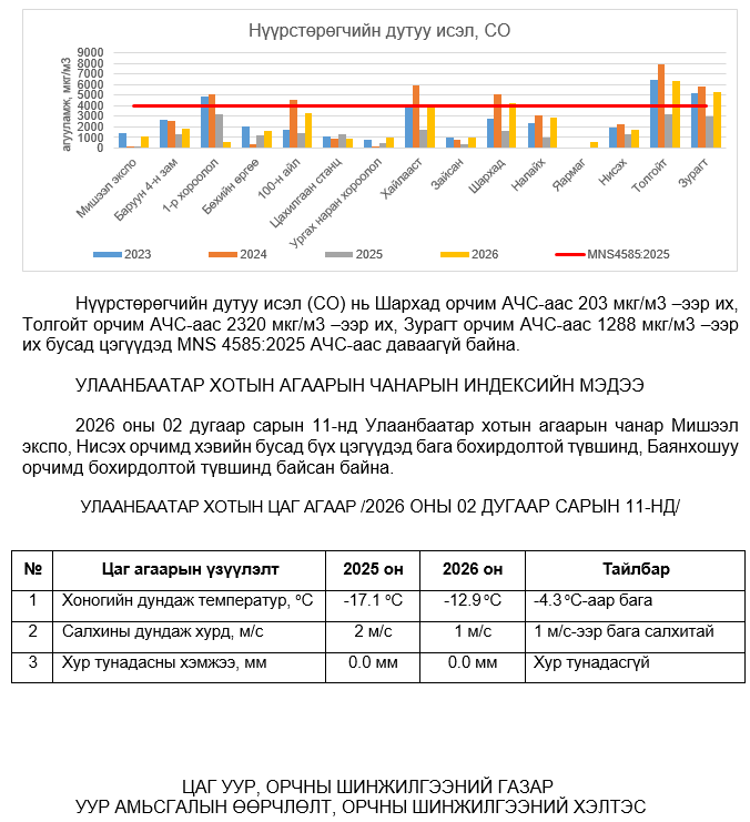 УЛААНБААТАР ХОТЫН АГААРЫН ЧАНАРЫН ХЯНАЛТ ШИНЖИЛГЭЭНИЙ ХОНОГИЙН МЭДЭЭ /2026.04.13/