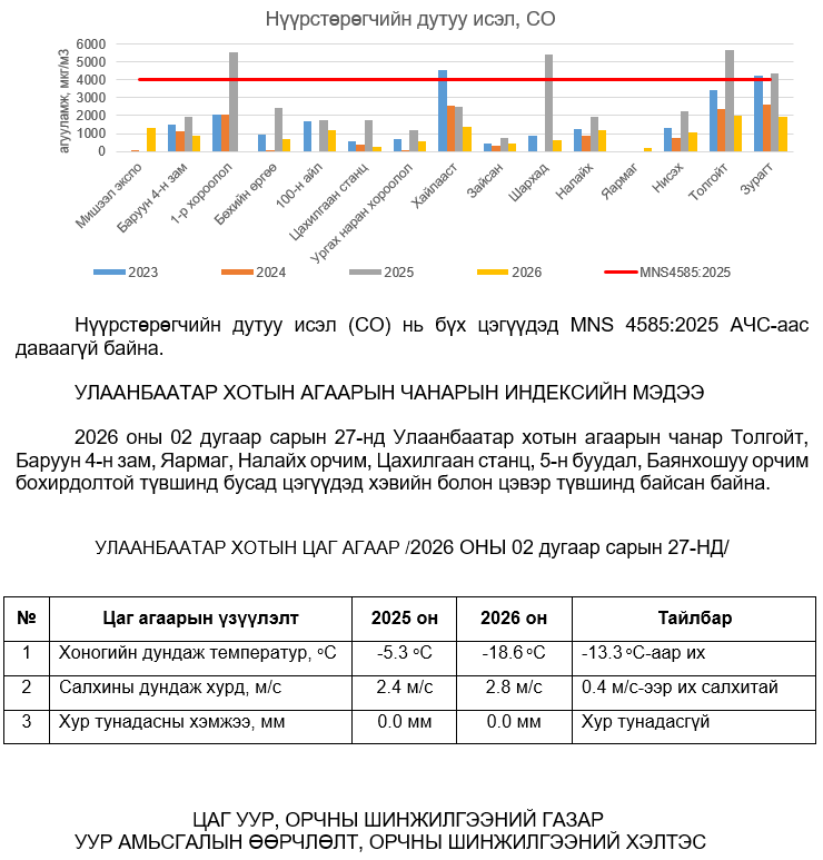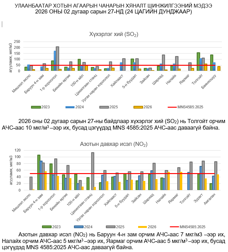 УЛААНБААТАР ХОТЫН АГААРЫН ЧАНАРЫН ХЯНАЛТ ШИНЖИЛГЭЭНИЙ ХОНОГИЙН МЭДЭЭ /2026.02.27/