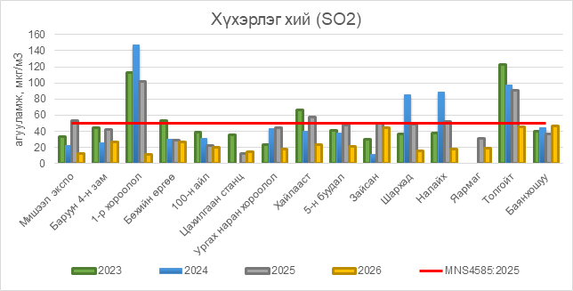 2026 оны 03 дугаар сарын 11-ний байдлаар хүхэрлэг хий (SO2) нь бүх цэгүүдэд MNS 4585:2025 АЧС-аас даваагүй байна.